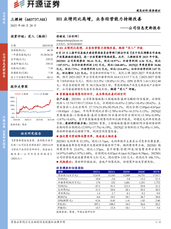 【开源证券】【20250828】三棵树-603737.SH-H1业绩同比高增,业务经营能力持续改善-4页 证券期货研究报告