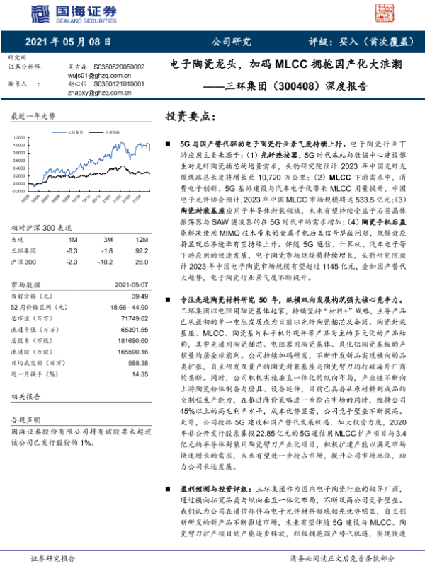 【国海证券】【20210508】三环集团:电子陶瓷龙头,加码MLCC拥抱国产化大浪潮-39页 行业研究