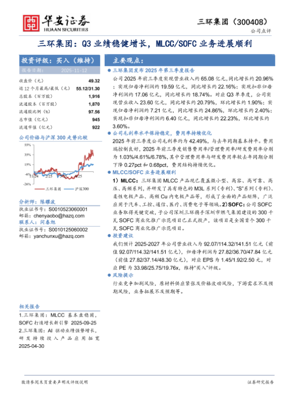 【华安证券】【202511】三环集团:Q3业绩稳健增长,MLCC/SOFC业务进展顺利-4页 证券期货研究报告
