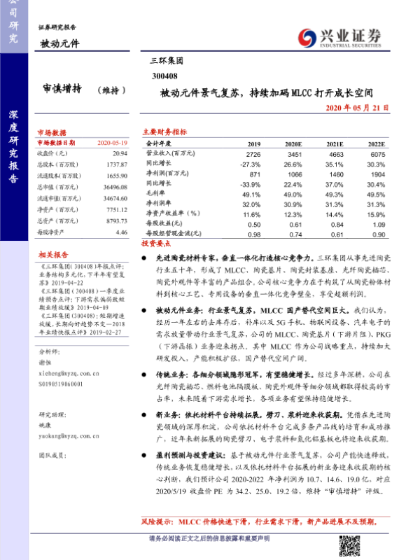 【兴业证券】【20200521】被动元件景气复苏,持续加码MLCC打开成长空间-30页 行业研究