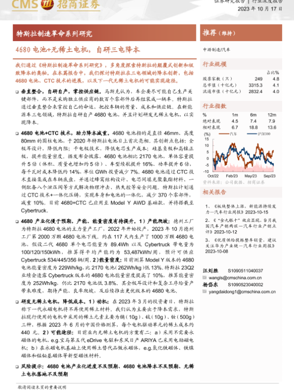 【海通证券】【20231017】20231017-招商证券-汽车行业深度报告:特斯拉制造革命系列研究-4680电池+无稀土电机,自研三电降本-17页 行业研究
