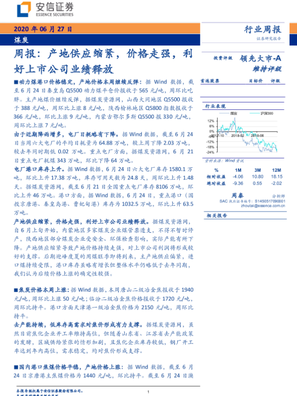 【安信证券】【20200627】20200627-安信证券-煤炭周报:产地供应缩紧,价格走强,利好上市公司业绩释放-24页 行业研究