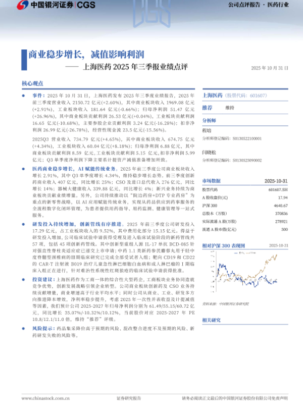 【银河证券】【202510】商业稳步增长,减值影响利润—— 上海医药 2025年三季报业绩点评-4页 证券期货研究报告