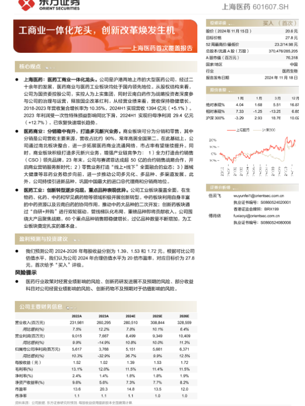 【东方证券】【20241118】上海医药首次覆盖报告:工商业一体化龙头,创新改革焕发生机-25页 行业研究