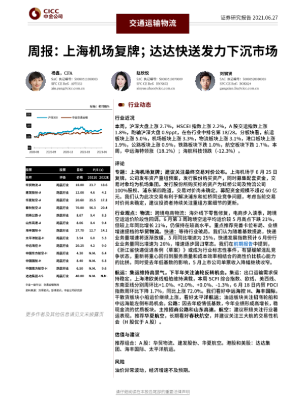 【中金公司】【20210627】交通运输物流行业周报:上海机场复牌;达达快送发力下沉市场-22页 行业研究