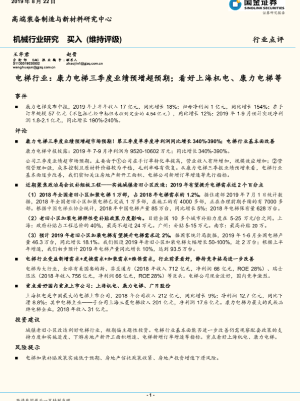 【国金证券】【20190822】电梯行业:康力电梯三季度业绩预增超预期;看好上海机电、康力电梯等-4页 行业研究
