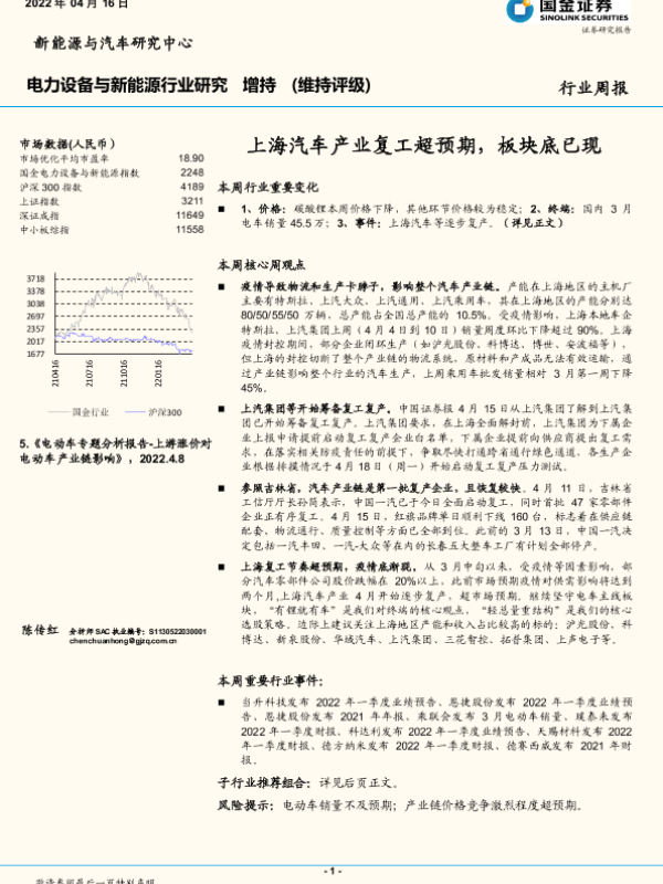 【国金证券】【20220416】电力设备与新能源行业研究:上海汽车产业复工超预期,板块底已现-13页 行业研究