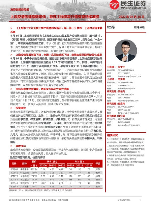 【民生证券】【20220418】消费者服务周报:上海疫情传播指数降低,复苏主线修复行情有望持续演绎-27页 行业研究