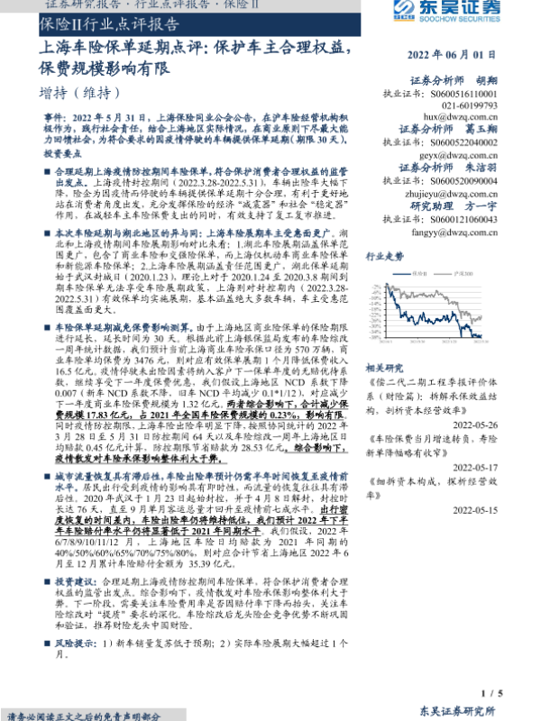 【东吴证券】【20220601】上海车险保单延期点评:保护车主合理权益,保费规模影响有限-5页 行业研究
