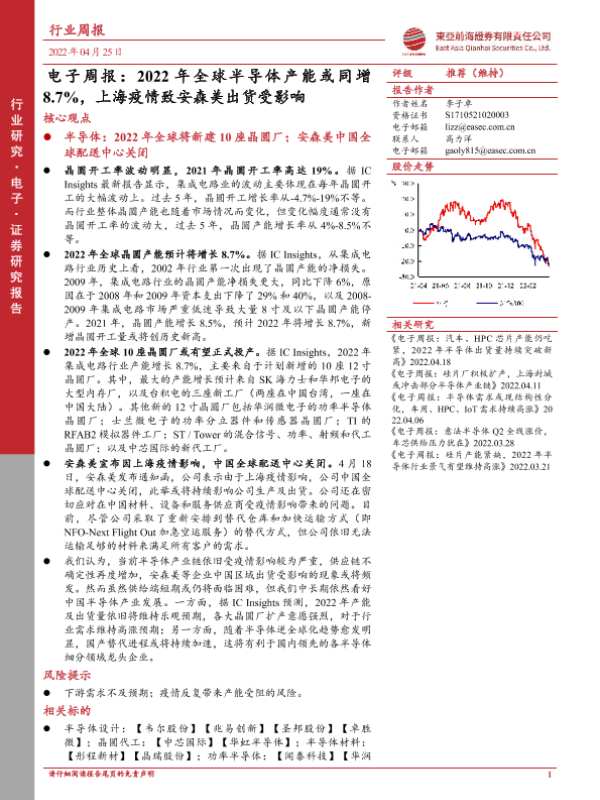 【东亚前海证券】【20220425】电子周报:2022年全球半导体产能或同增8.7%,上海疫情致安森美出货受影响-17页 行业研究