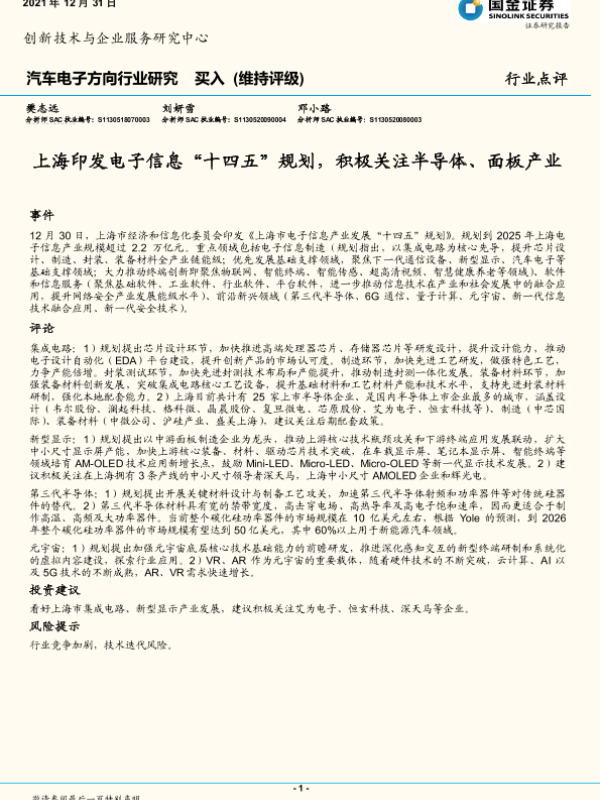 【国金证券】【20211231】汽车电子方向行业点评:上海印发电子信息“十四五”规划,积极关注半导体、面板产业-3页 行业研究