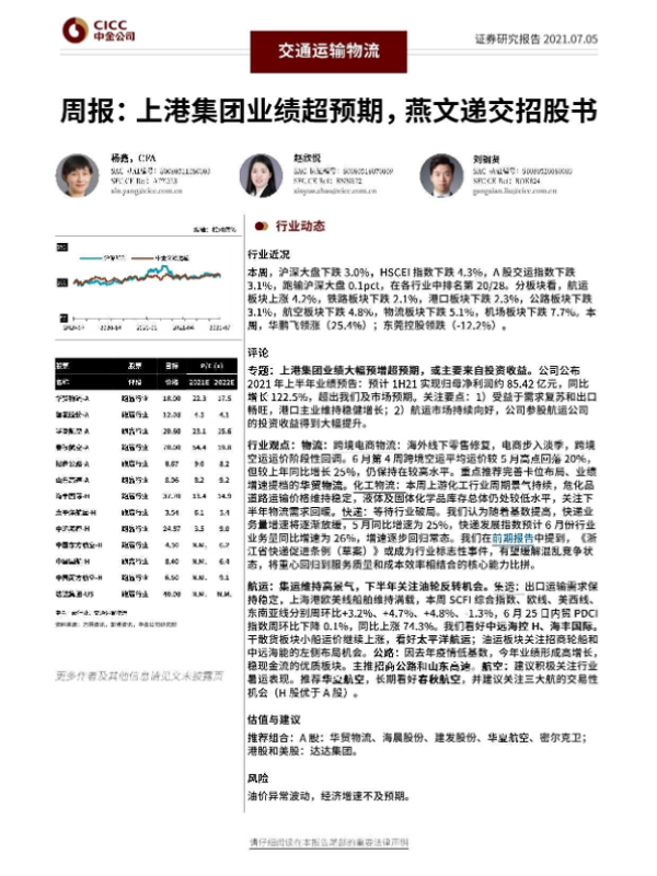【中金公司】【20210705】交通运输物流周报:上港集团业绩超预期,燕文递交招股书-24页 行业研究