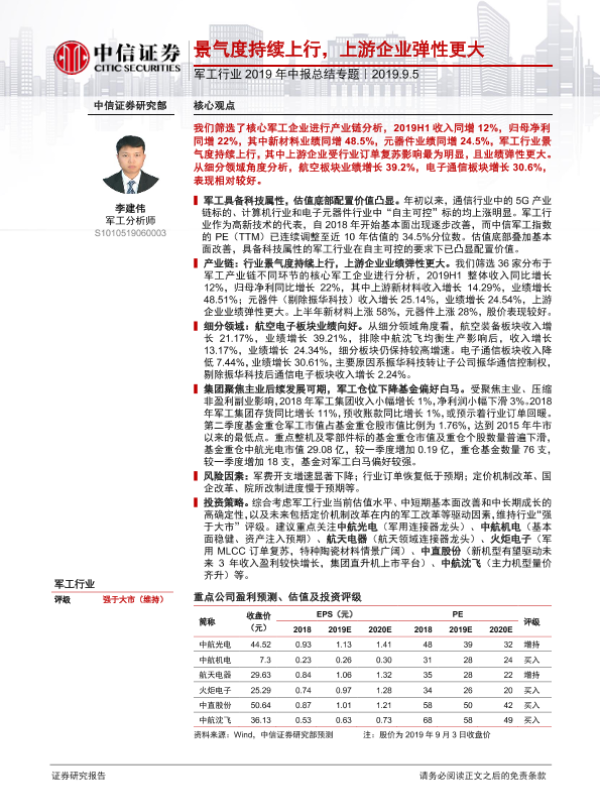 【中信证券】【20190905】军工行业2019年中报总结专题:景气度持续上行,上游企业弹性更大-18页 行业研究