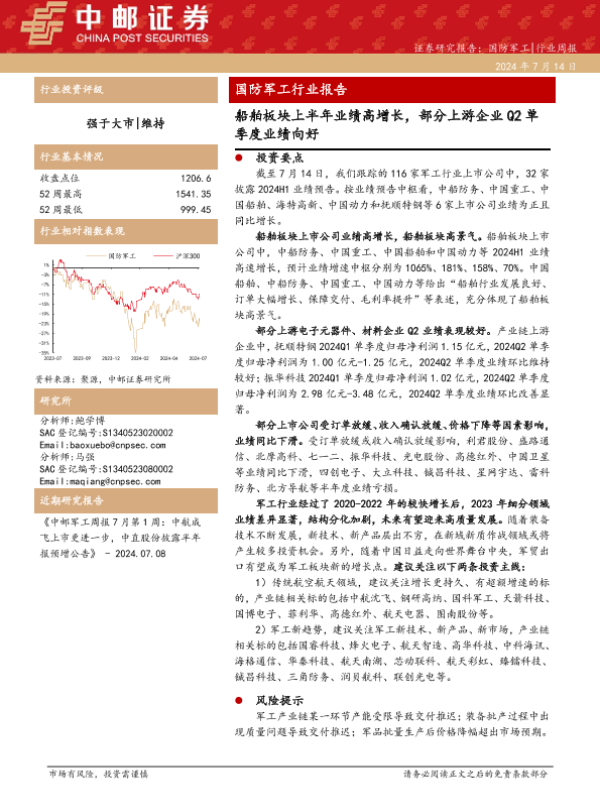 【中邮证券】【20240714】国防军工行业报告:船舶板块上半年业绩高增长,部分上游企业Q2单季度业绩向好-19页 行业研究