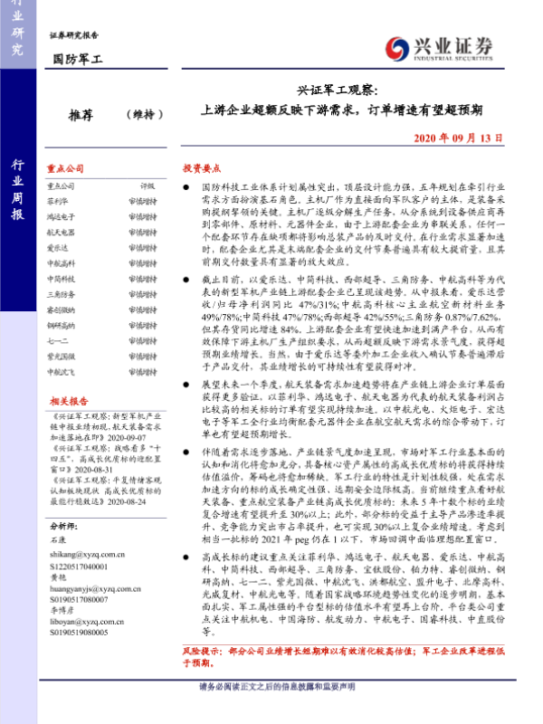 【兴业证券】【20200913】兴证军工观察:上游企业超额反映下游需求,订单增速有望超预期-14页 行业研究