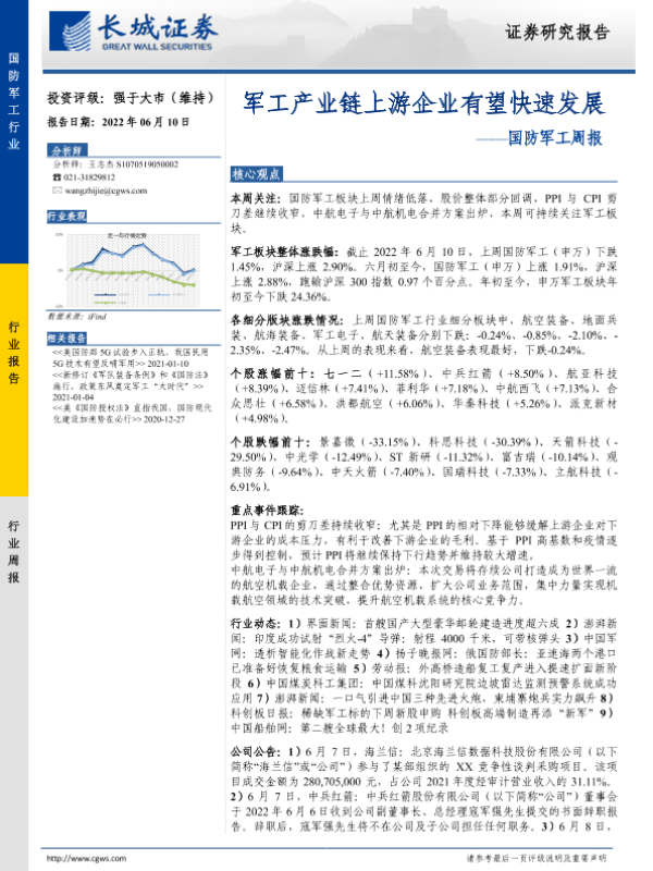 【长城证券】【20220610】20220610-长城证券-国防军工周报:军工产业链上游企业有望快速发展-13页 行业研究