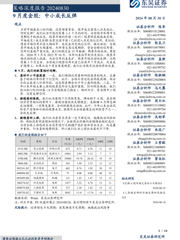 【东吴证券】【20240830】策略深度报告:9月度金股,中小成长反弹-14页 行业研究