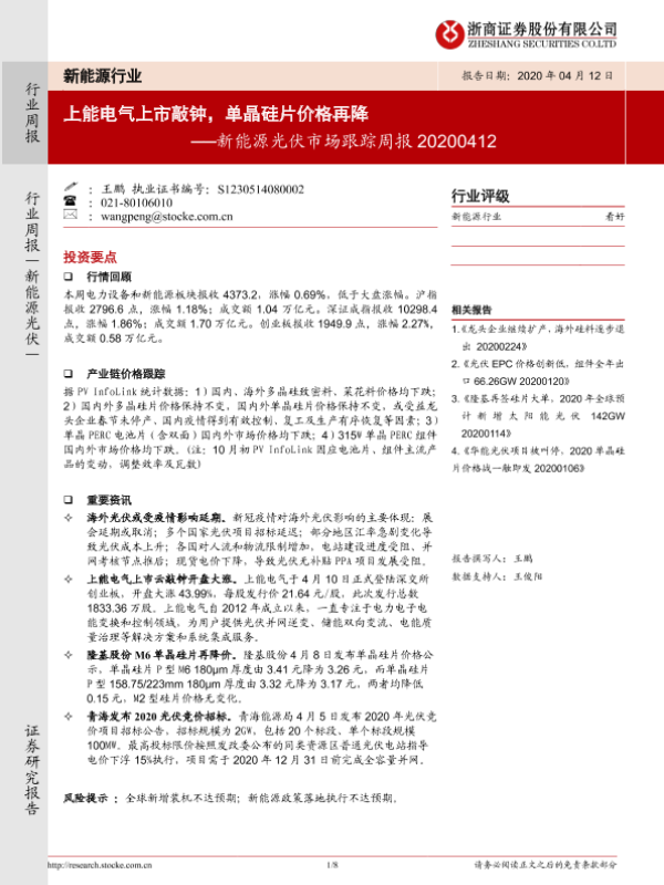 【浙商证券】【20200412】20200412-浙商证券-新能源光伏市场跟踪周报:上能电气上市敲钟,单晶硅片价格再降-8页 行业研究