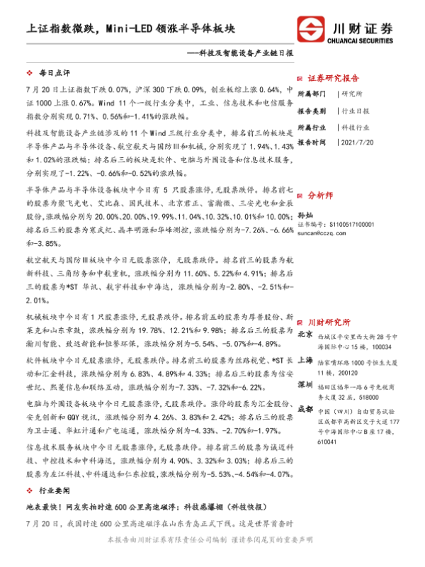 【川财证券】【20210720】科技及智能设备产业链日报:上证指数微跌,Mini-LED领涨半导体板块-3页 证券期货研究报告