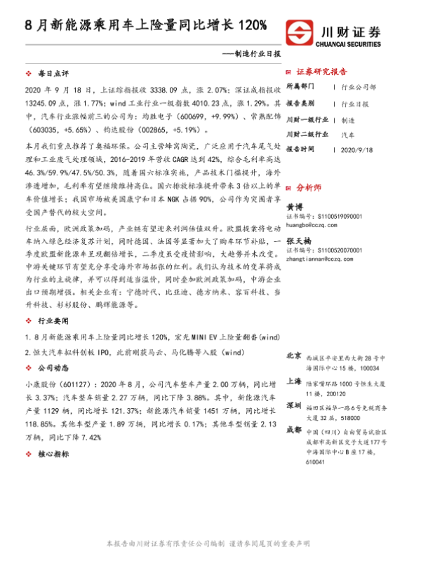 【川财证券】【20200918】制造行业日报:8月新能源乘用车上险量同比增长120%-3页 证券期货研究报告