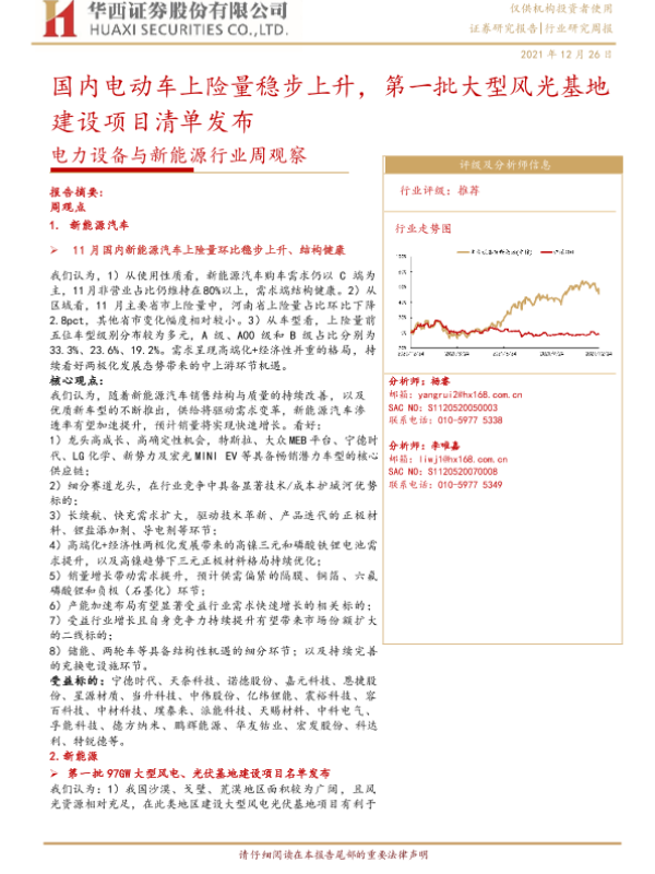 【华西证券】【20211226】电力设备与新能源行业周观察:国内电动车上险量稳步上升,第一批大型风光基地建设项目清单发布-17页 行业研究