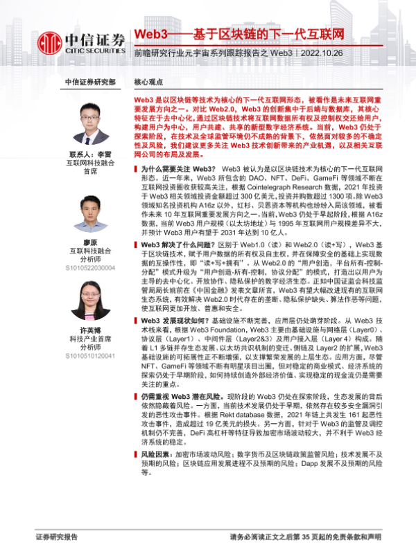 【中信证券】【20221026】科技行业前瞻研究行业元宇宙系列跟踪报告之Web3:Web3_基于区块链的下一代互联网-36页 行业研究