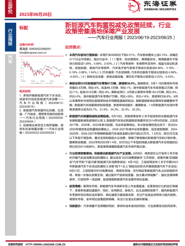 【东海证券】【20230626】20230626-东海证券-汽车行业周报:新能源汽车购置税减免政策延续,行业政策密集落地保障产业发展-12页 行业研究