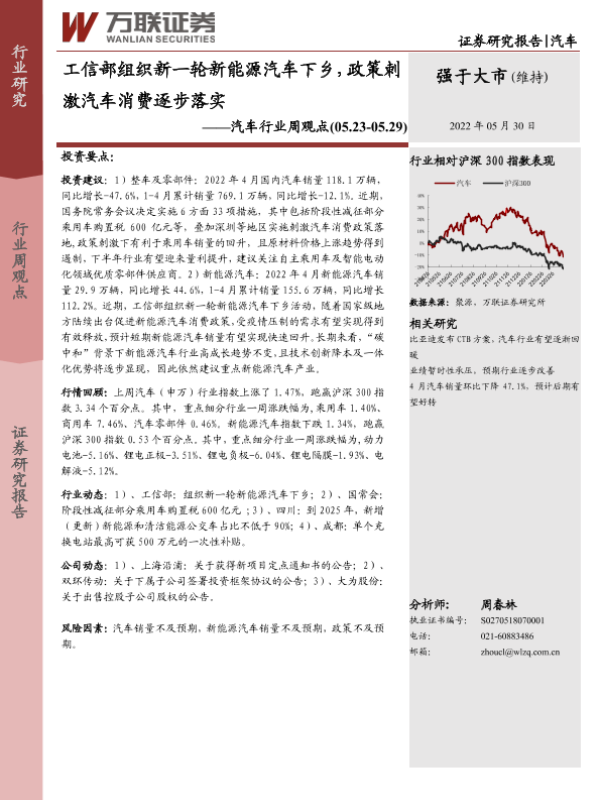 【万联证券】【20220530】工信部组织新一轮新能源汽车下乡,政策刺激汽车消费逐步落实-12页 行业研究