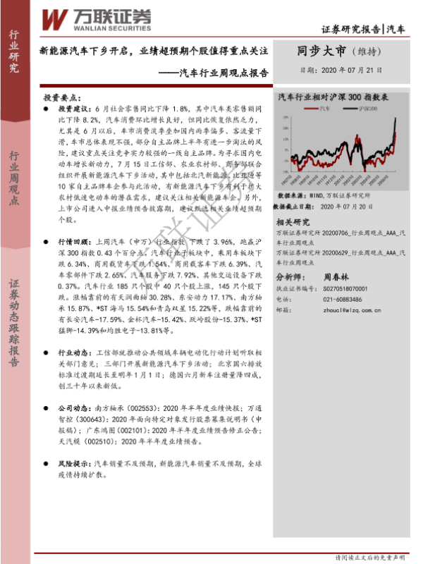 【万联证券】【20200721】20200721-万联证券-汽车行业周观点报告:新能源汽车下乡开启,业绩超预期个股值得重点关注-13页 行业研究