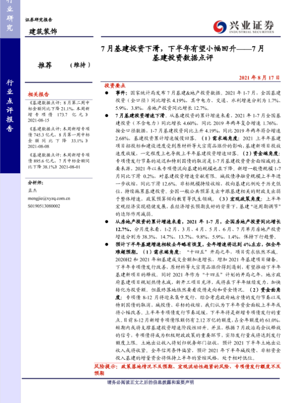 【兴业证券】【20210817】7月基建投资下滑,下半年有望小幅回升-5页 行业研究