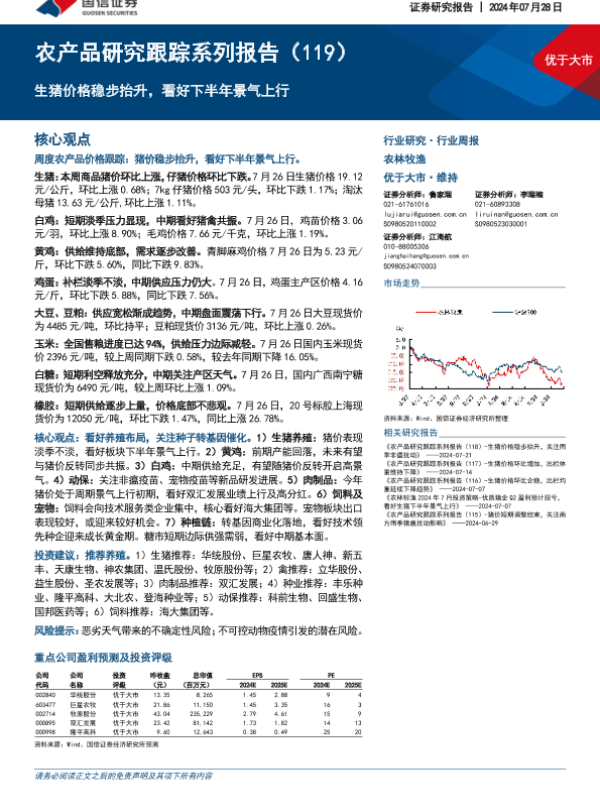 【国信证券】【20240728】20240728-国信证券-农产品研究跟踪系列报告(119):生猪价格稳步抬升,看好下半年景气上行-26页 行业研究