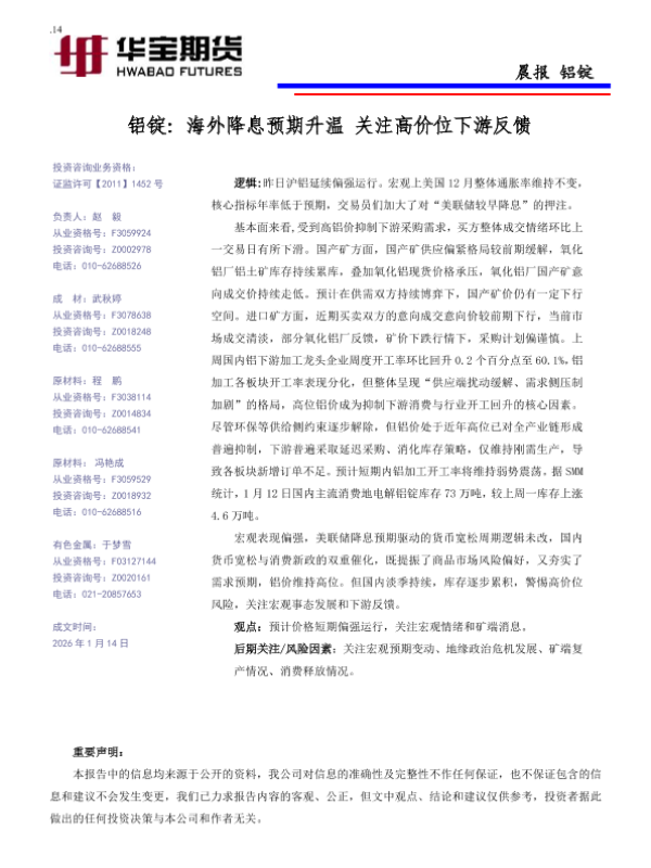 【华宝期货】【202601】铝锭_海外降息预期升温_关注高价位下游反馈-2页 证券期货研究报告