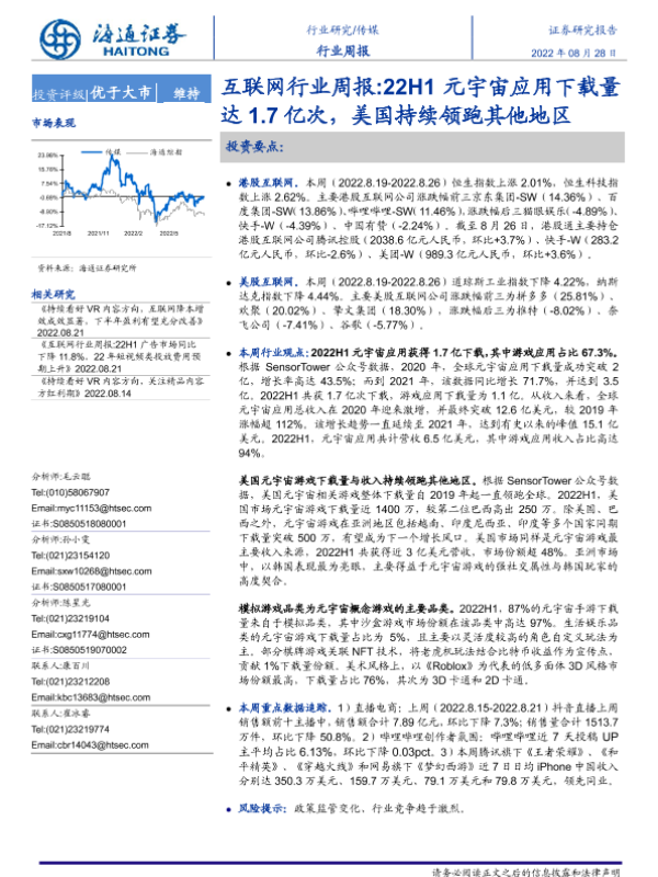 【海通证券】【20220828】互联网行业周报:22H1元宇宙应用下载量达1.7亿次-9页 行业研究