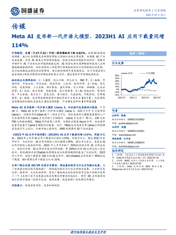 【国盛证券】【20230723】传媒行业周报:Meta AI发布新一代开源大模型,2023H1 AI应用下载量同增114%-10页 行业研究