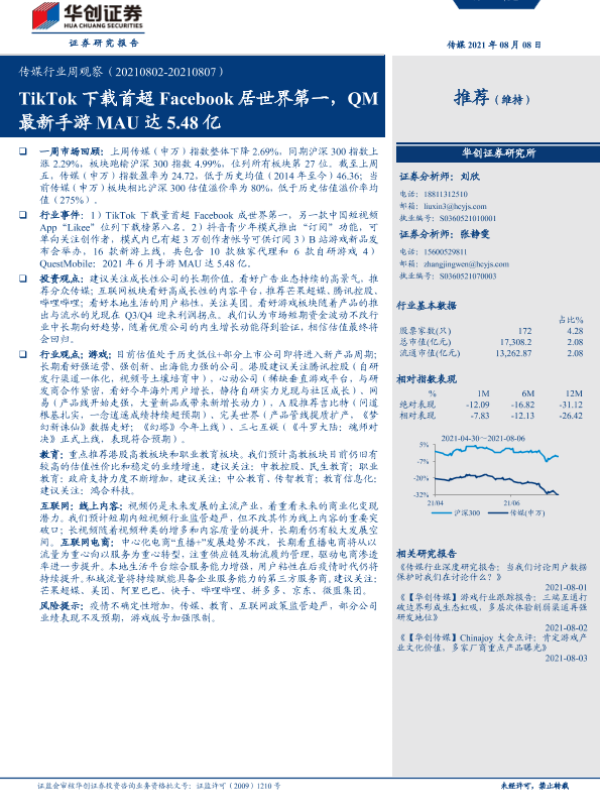 【华创证券】【20210808】20210808-华创证券-传媒行业周观察:TikTok下载首超Facebook居世界第一,QM最新手游MAU达5.48亿-23页 行业研究