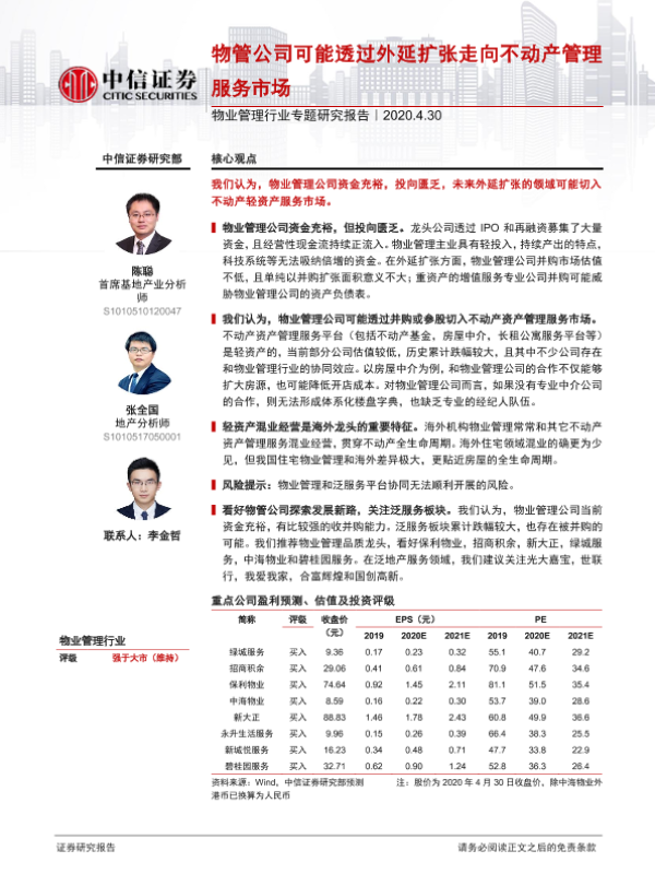 【中信证券】【20200430】物管公司可能透过外延扩张走向不动产管理服务市场-16页 行业研究