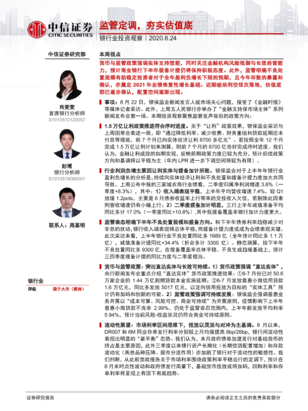 【中信证券】【20200824】银行业投资观察:监管定调,夯实估值底-10页 行业研究