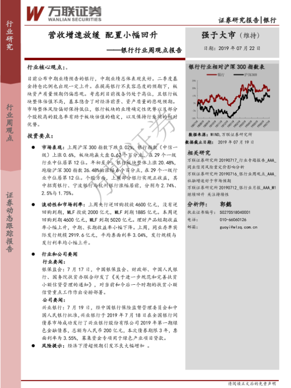 【万联证券】【20190722】银行行业周观点报告:营收增速放缓 配置小幅回升-10页 行业研究