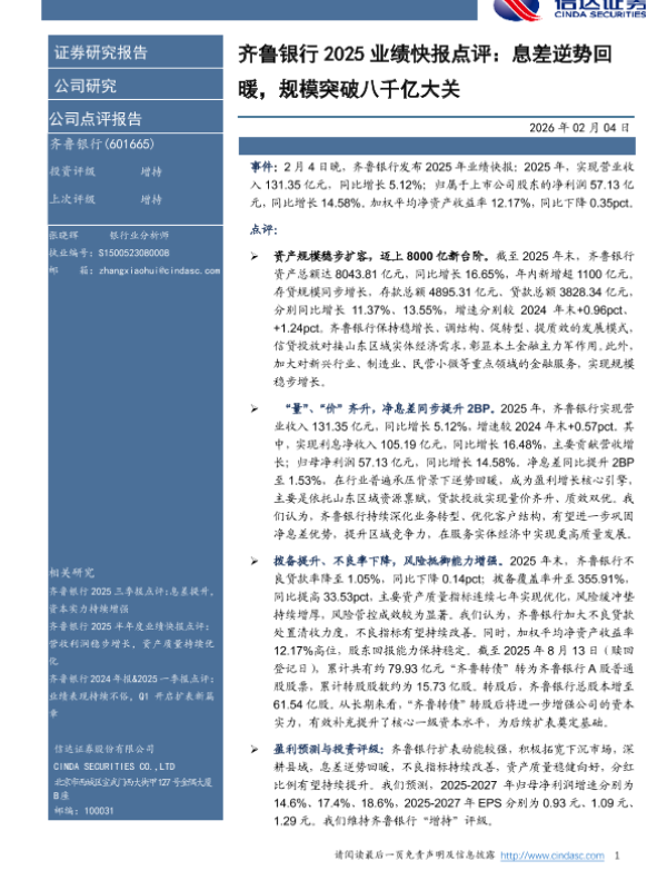 【信达证券】【202602】齐鲁银行2025业绩快报点评:息差逆势回暖,规模突破八千亿大关-6页 证券期货研究报告