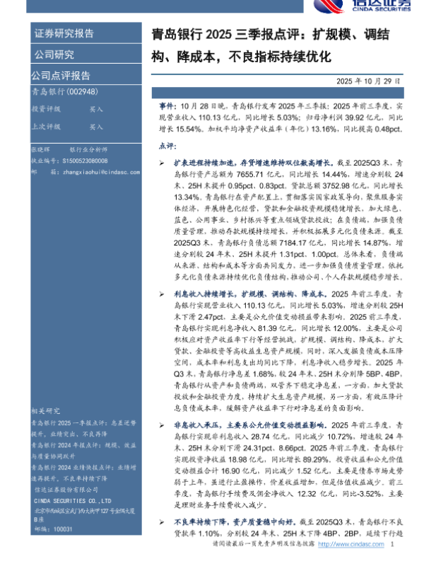 【信达证券】【2025】青岛银行2025三季报点评:扩规模、调结构、降成本,不良指标持续优化-6页 证券期货研究报告