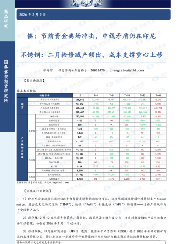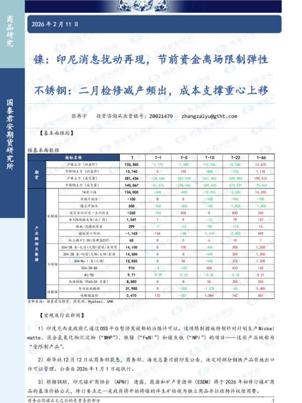 【国泰君安期货】【202602】镍_印尼消息扰动再现_节前资金离场限制弹性_不锈钢_二月检修减产频出_成本支撑重心上移-3页 证券期货研究报告