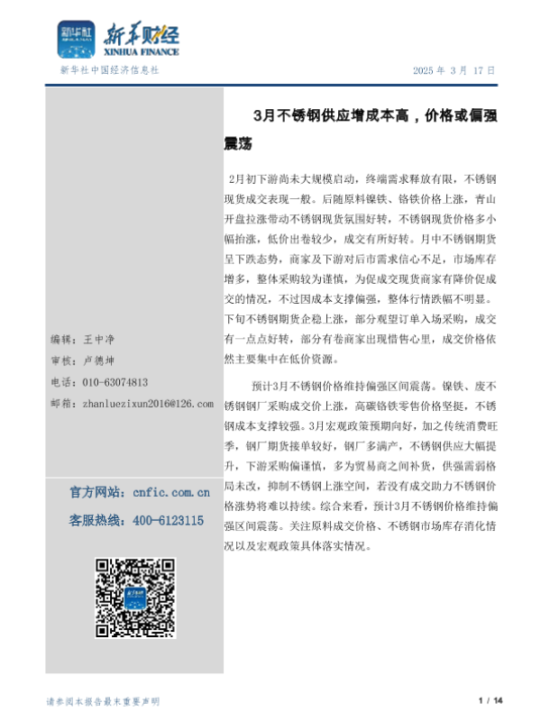 【新华社中国经济信息社】【20250317】3月不锈钢供应增成本高,价格或偏强震荡-14页 行业研究