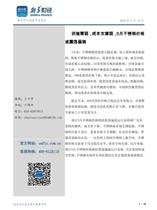 【新华社中国经济信息社】【20250515】供强需弱,成本支撑弱,5月不锈钢价格或震荡偏弱-16页 行业研究