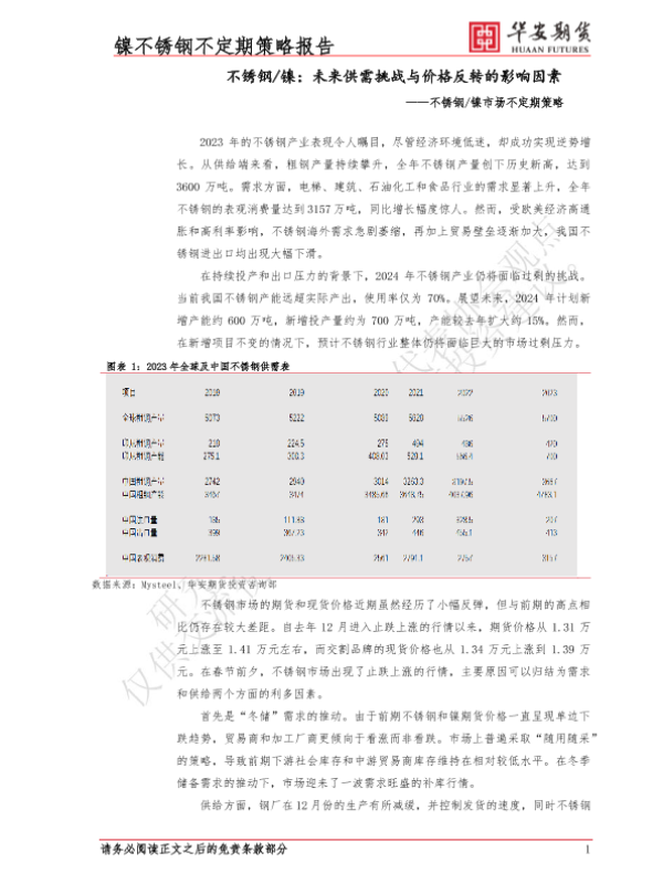 【华安期货】【20240202】不锈钢 镍市场不定期策略:未来供需挑战与价格反转的影响因素-10页 行业研究
