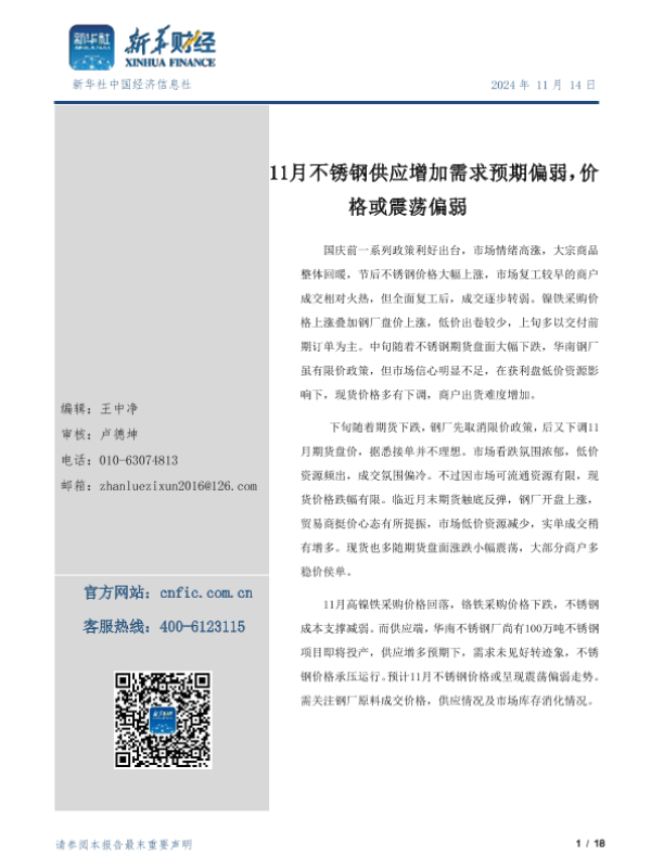 【新华财经】【20241114】11月不锈钢供应增加需求预期偏弱,价格或震荡偏弱-18页 行业研究