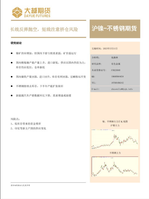 【大越期货】【20230531】沪镍_不锈钢期货:长线反弹抛空,短线注意挤仓风险-16页 行业研究
