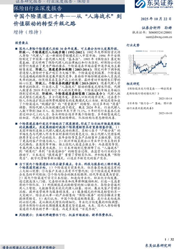 【东吴证券】【202510】保险Ⅱ行业深度报告:中国个险渠道三十年——从“人海战术”到价值驱动的转型升级之路-32页 证券期货研究报告