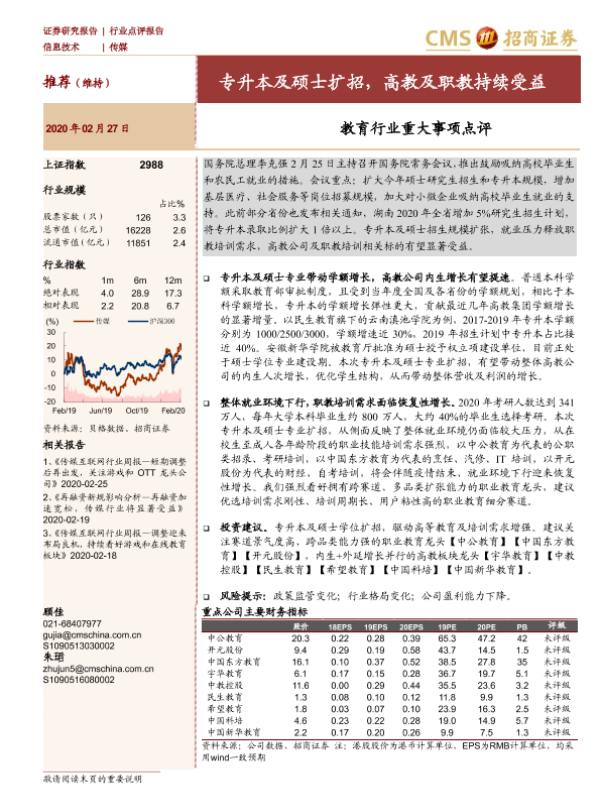 【上海证券】【20200302】20200302-上海证券-教育行业动态:硕士与专升本拟扩招,关注低估值的高教资产-9页 行业研究