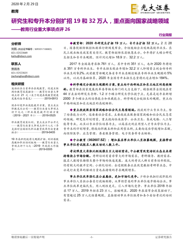 【光大证券】【20200229】教育行业重大事项点评26:研究生和专升本分别扩招19和32万人,重点面向国家战略领域-3页 证券期货研究报告