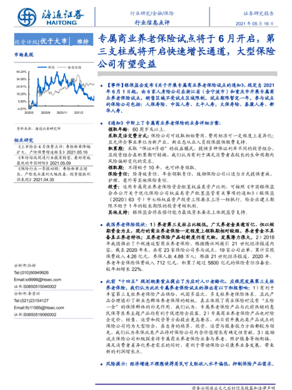 【海通证券】【20210516】保险行业信息点评:专属商业养老保险试点将于6月开启,第三支柱或将开启快速增长通道,大型保险公司有望受益-3页 行业研究